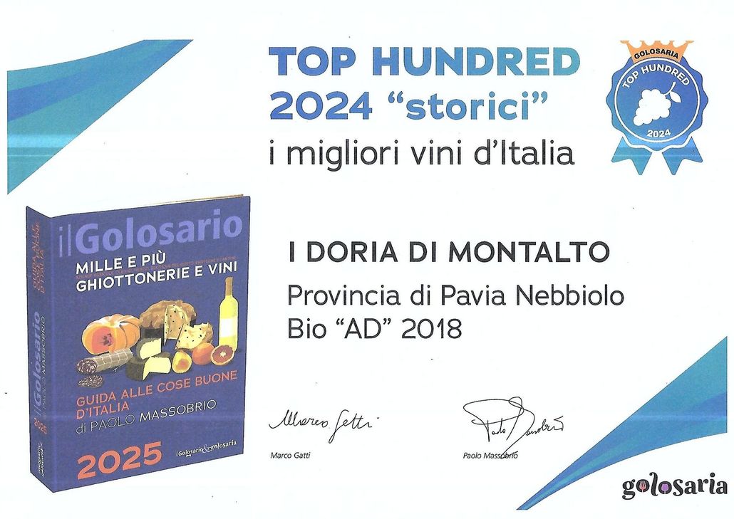 Azienda agricola Doria ha finalmente concluso un iter durato oltre 40 anni, iniziato nei primi anni '90 per il recupero prima del vitigno nebbiolo facendo inserire la vite nebbiolo nelle varietà di uve autorizzate e raccomandate per l'Oltrepò, poi del vino nebbiolo ottenendo la Igt nel 2010 con relazione, in sostegno alla nostra domanda di richiesta, preparata dal nostro Dott. Agronomo Daniele Manini. Dopo oltre 30 anni di prove di vinificazione, anche da base spumante metodo classico, abbiamo finalmente prodotto un vino nebbiolo annata 2018 bio che ha ottenuto un grande riconoscimento da parte di Paolo Massobrio e Marco Gatti a Golosaria 2024 a Milano con il premio Top Hundred Storico corona Oro.